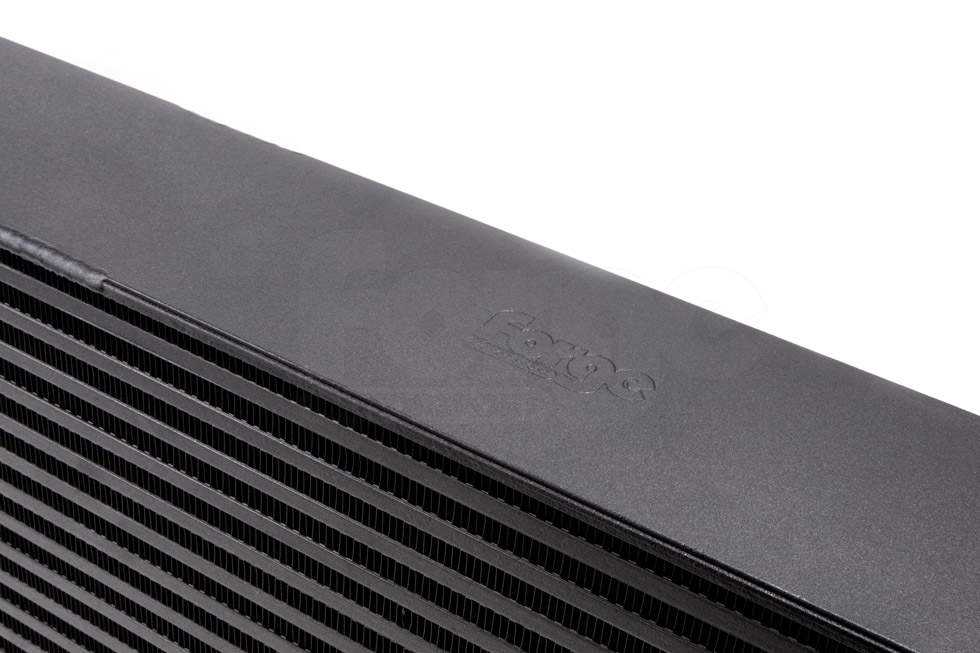 The core used for FMINT38 is a huge 640x250x100 and of bar and plate design. This gives it a huge 55% more surface area than OEM cooler, and an even more impressive 94% more volume (8.2 litres increased to 16l litres). The end tanks are made with integrated pipes in order to retain the stock boost hoses, though you can also replace the hoses with our FMKT024 boost hose set if you so wish. Just like on the 8V chassis, we supply a genuine Audi RSQ crash bar which we modify in house in order to accept the new larger core, then finish both the crash bar and core in our standard black finish powder coat for maximum longevity.