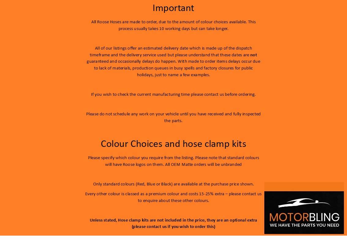 All Roose Motorsport Hoses come with a LIFETIME WARRANTY, showing the quality and confidence they have in their products.